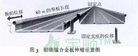 屋面板基材通常采用國際牌號AA3004 的鋁鎂錳合金壓型制作,合金狀態為H36/H46。其屈服強度≥190 MPa,抗拉強度在240~285 MPa,伸長率≥3%。收邊板基材采用國際牌號AA3004 的鋁鎂錳合金壓型制作,合金狀態為H34/H44,其屈服強度170MPa ,抗拉強度在220~265 MPa ,伸長率≥3%。