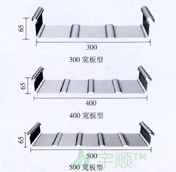 直板板型肋高一般為65 mm,常用的板寬有300mm、400 mm 及500 mm(圖9)。其中板寬300mm 的在屋面荷載較大時使用;400 mm 的為常用、經濟型的;500 mm 的為屋面板本身最經濟的板型,但下部檁條間距小,且需采取適當措施防止板變形。板型詳況,見圖10。