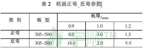 彎弧板機器正彎、反彎參數,見表2。