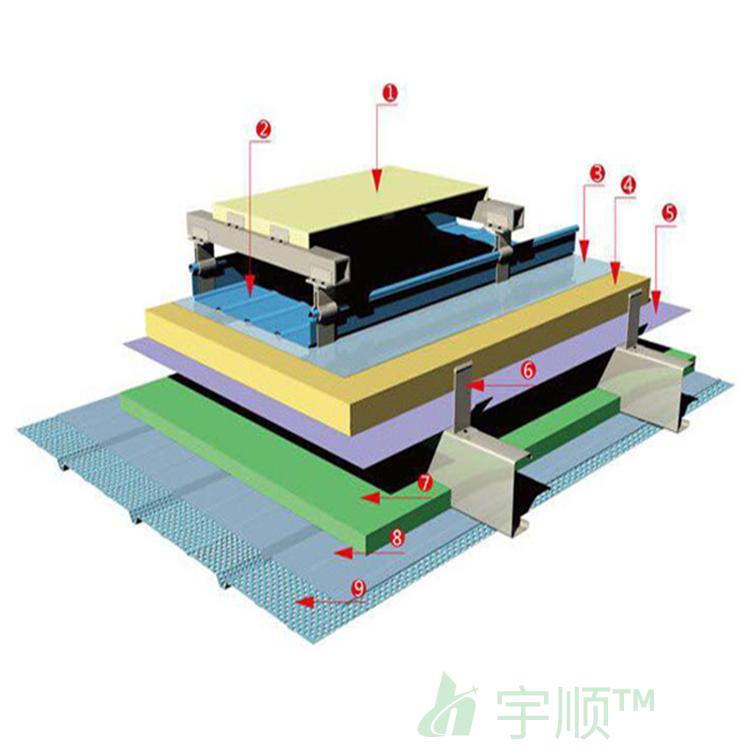 根據(jù)《建筑物防雷設(shè)計(jì)規(guī)范》第4.1.4條規(guī)定:當(dāng)金屬板下無易燃物品,板厚≥0.5mm時(shí),屋面板可作為接閃器。屋面施工時(shí)通過設(shè)置專用的避雷節(jié)點(diǎn),將金屬屋面板與下鋼結(jié)構(gòu)上下連通,形成回路,使屋面電流通過金屬物的上下傳遞,導(dǎo)入地面。屋面系統(tǒng)防雷處理,主要以屋面板及鋼連接件連通,作為防雷節(jié)點(diǎn),使電流能上下傳遞。屋面板為導(dǎo)電金屬物體,其下鋼檁條等與鋼結(jié)構(gòu)相連,可直接傳導(dǎo)電流。由于鋁合金與鋼二種材料的物理性能差異,為防止二者接觸引起電化學(xué)反應(yīng),在設(shè)計(jì)時(shí),我們在二者連接處設(shè)置了絕緣物,主要表現(xiàn)為鋁合金支座下部的隔熱墊片。為了使之上下連通,我們在屋面上將布置避雷網(wǎng)線,通過鍍鋅鋼帶,將支座上的電流導(dǎo)入下部檁條,和鋼結(jié)構(gòu)連成一整體。避雷點(diǎn)的設(shè)置按照10×10米網(wǎng)格布置,在整個(gè)屋面形成網(wǎng)狀布設(shè)。